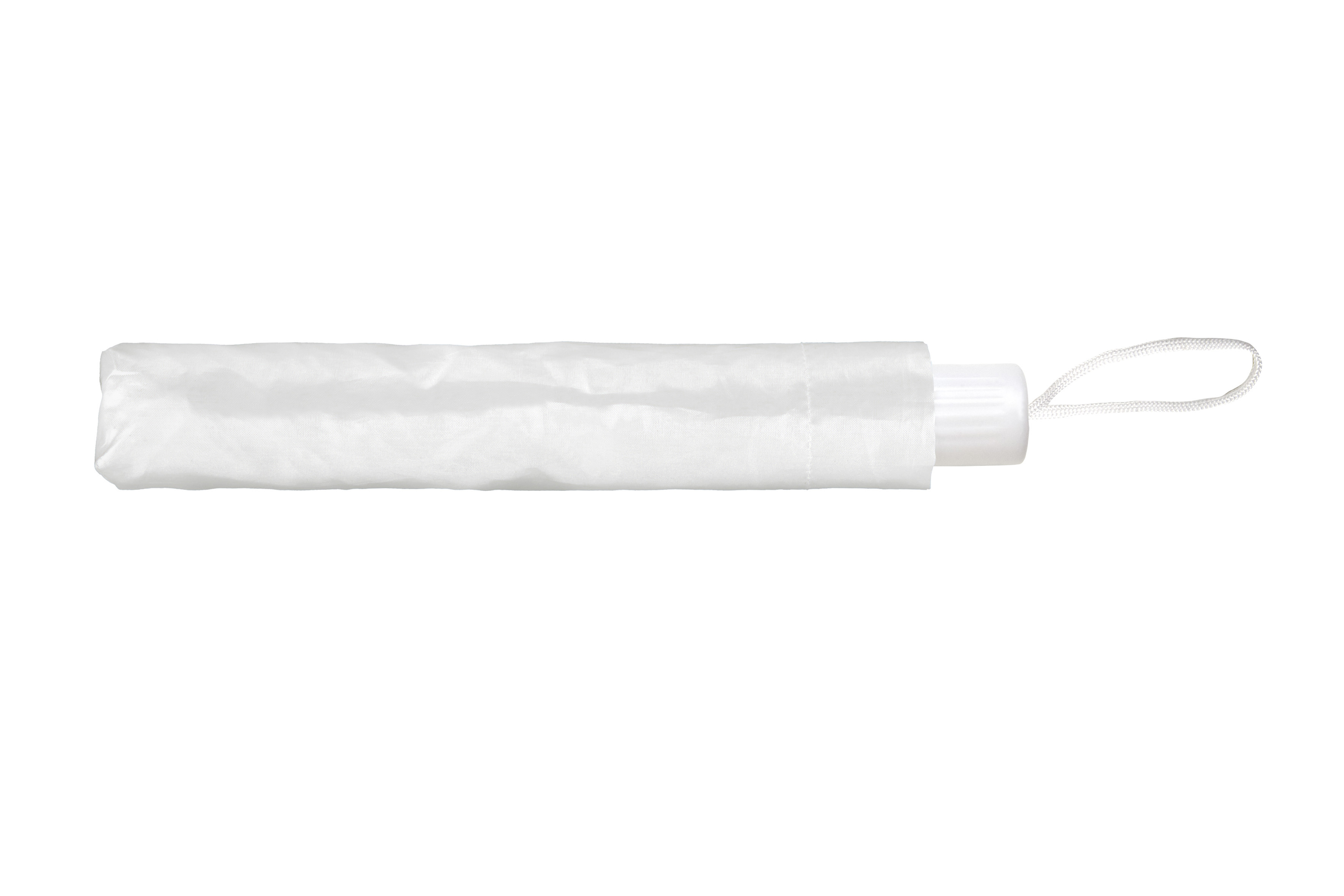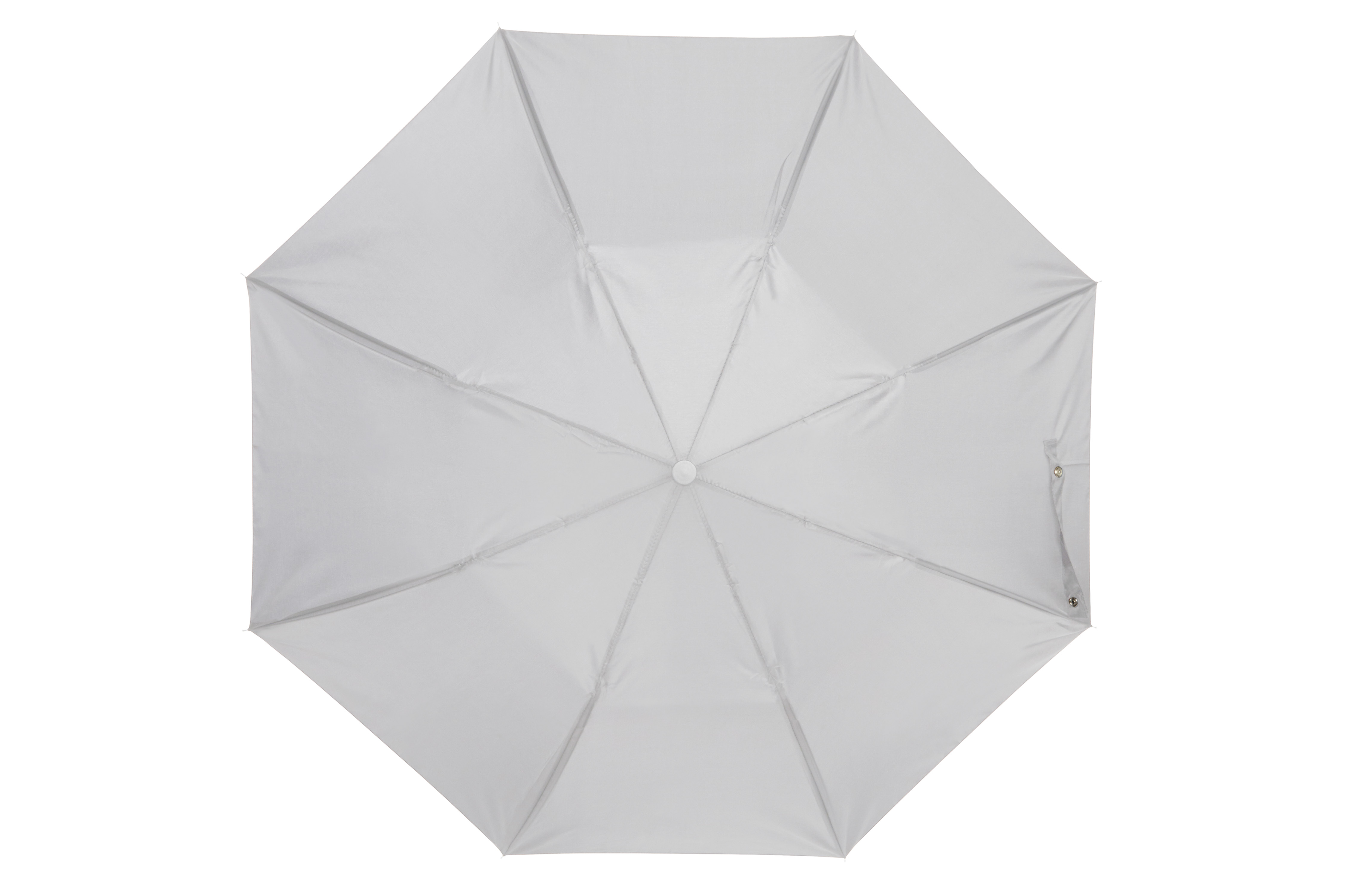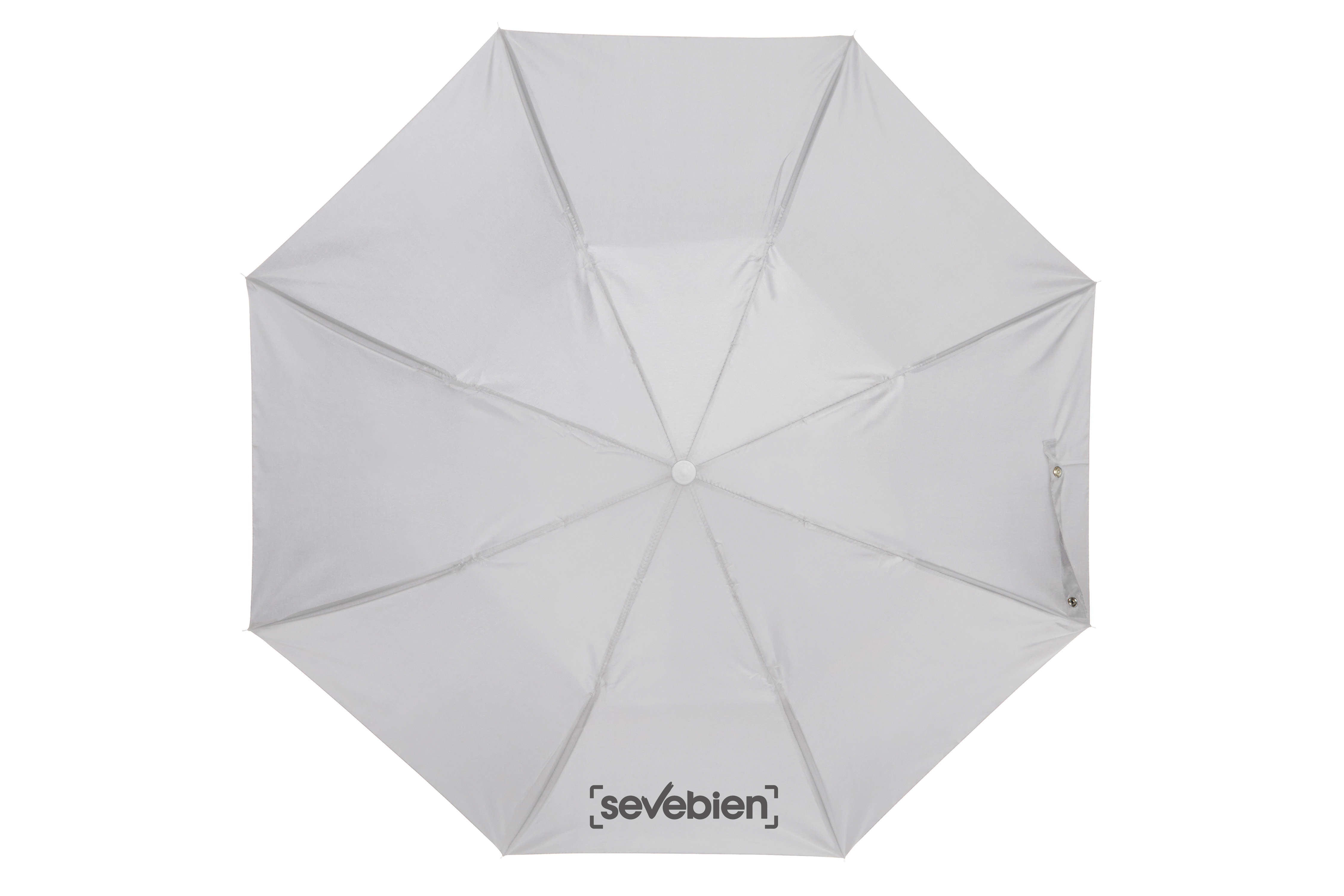 Ø 90 cm. Cerrado 32 cm. Poliéster.Extendido 50 cm. Estructura metálica 8 varillas. Plegable en tres partes. Mango plástico con cordón. Funda. APERTURA Y CIERRE MANUAL