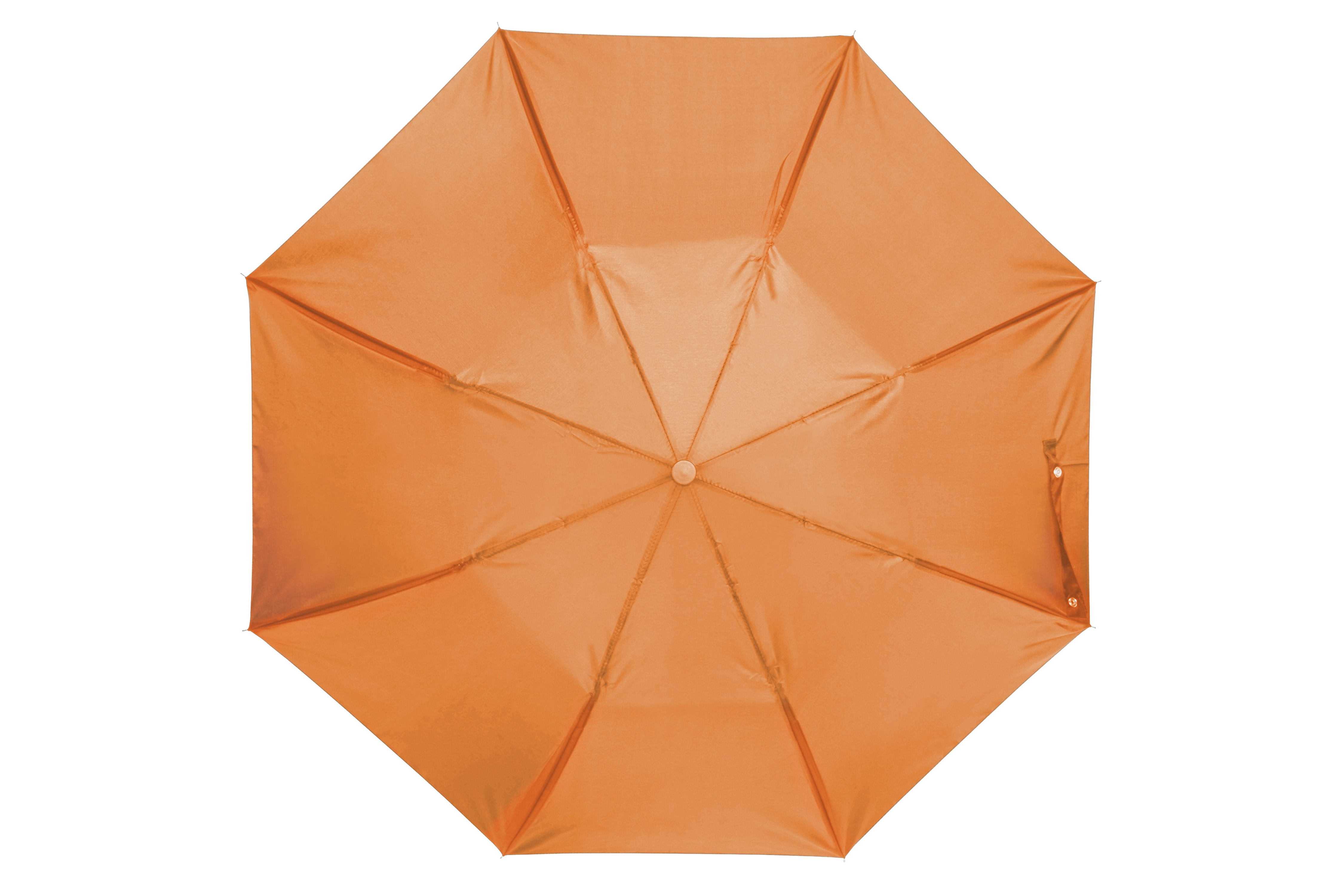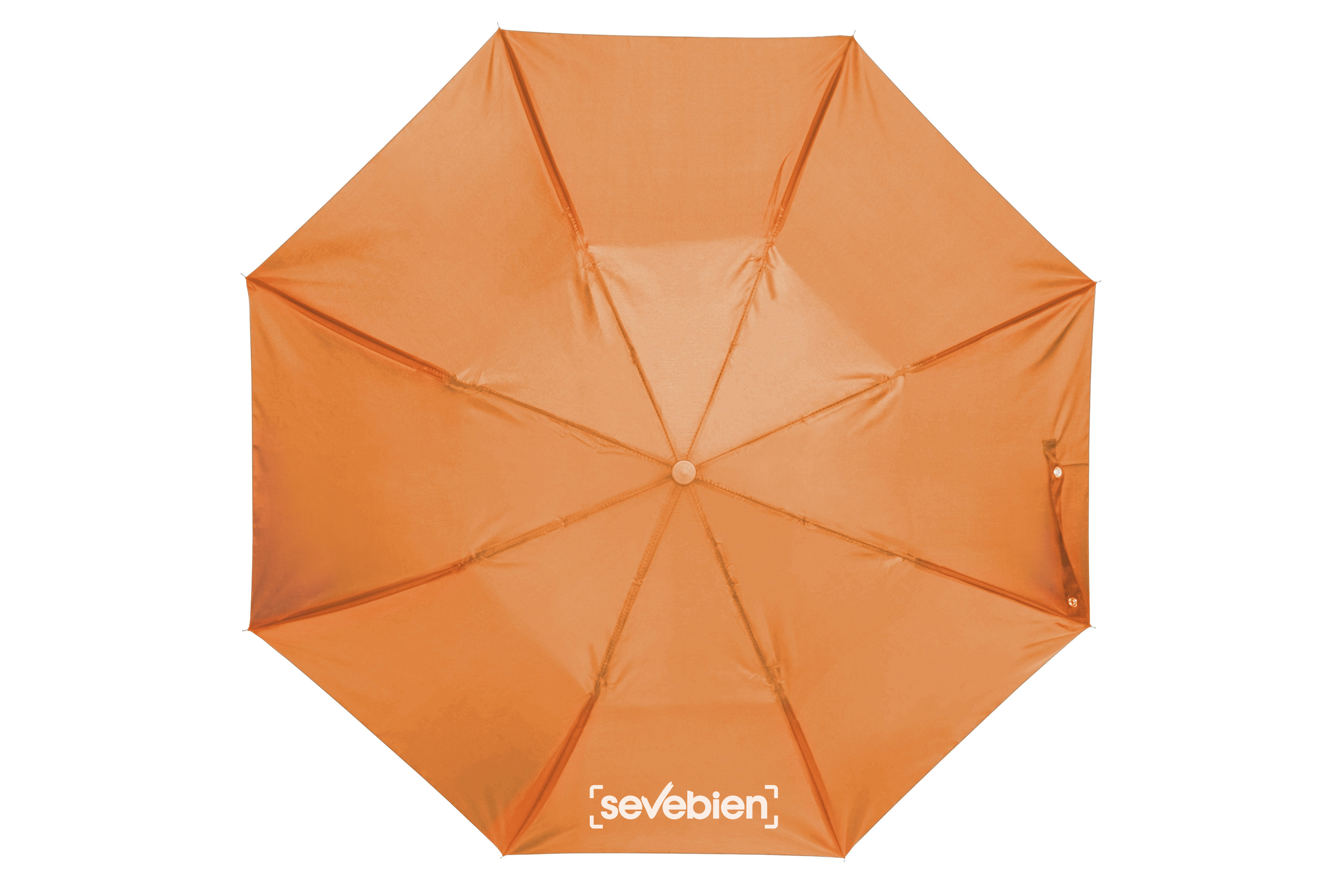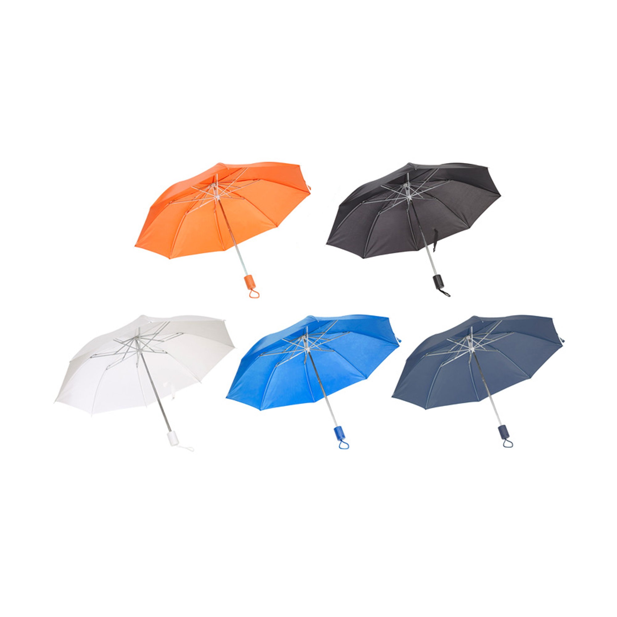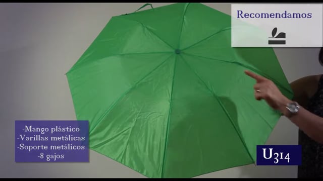 Ø 90 cm. Cerrado 32 cm. Poliéster.Extendido 50 cm. Estructura metálica 8 varillas. Plegable en tres partes. Mango plástico con cordón. Funda. APERTURA Y CIERRE MANUAL