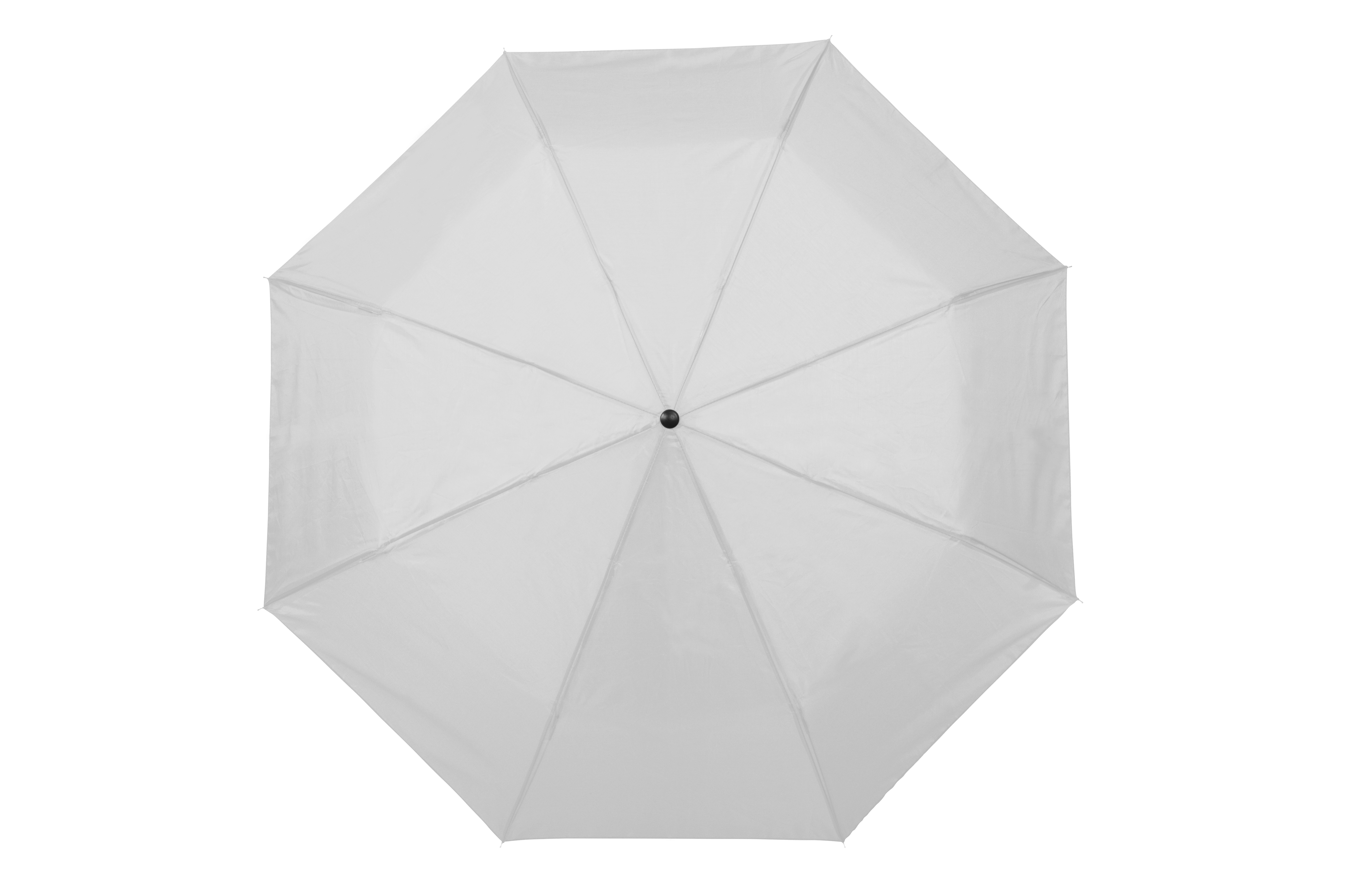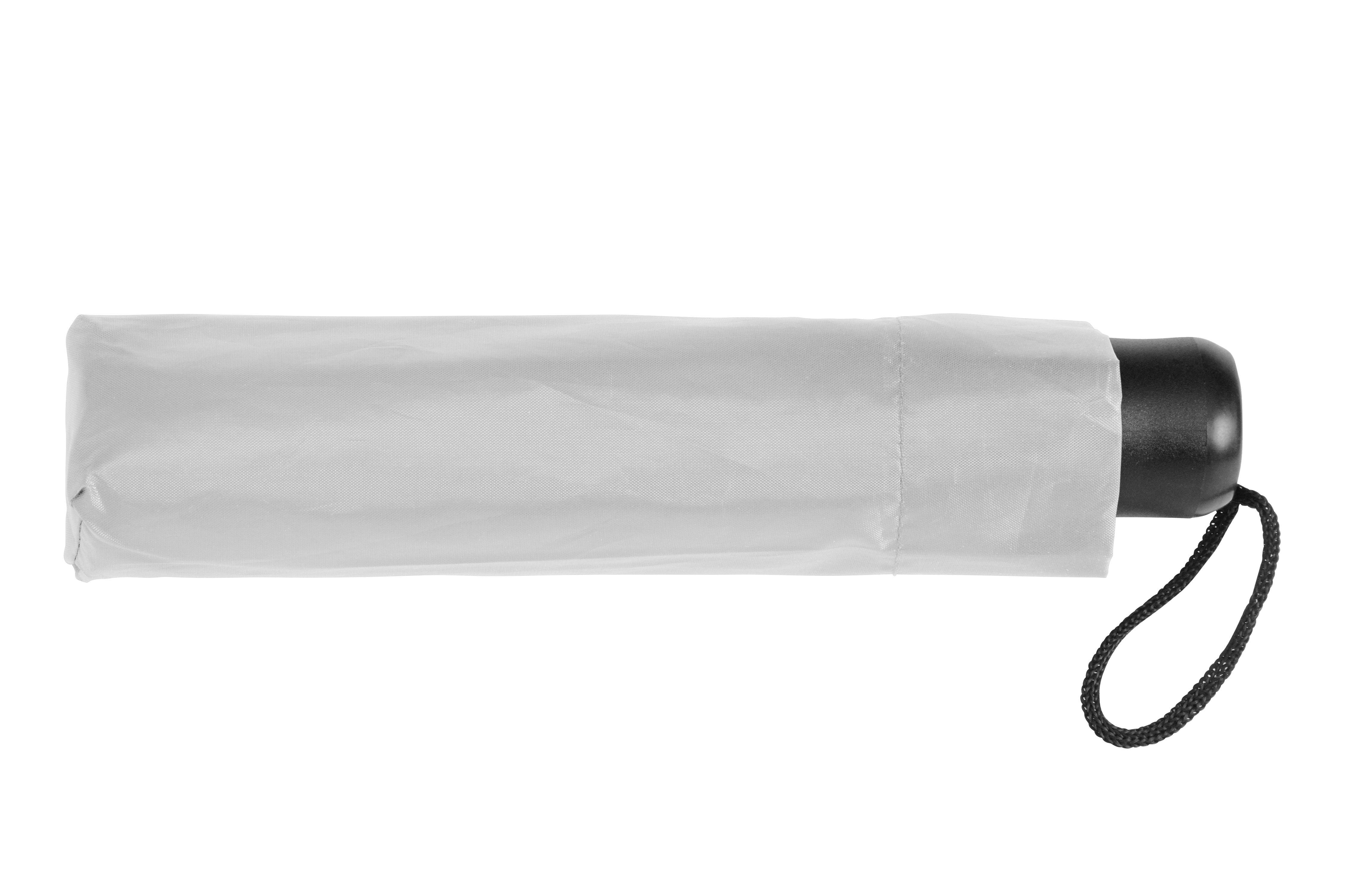 Ø 98 cm. 8 gajos. Ancho gajo 37 cm. Largo cerrado 24 cm. Largo abierto 54 cm. Poliéster, metal y plástico. Paraguas APERTURA Y CIERRE MANUAL. Eje y varillas metálicas. Mango de plástico negro con correa cordón color negro. Cierre con correa de velcro.