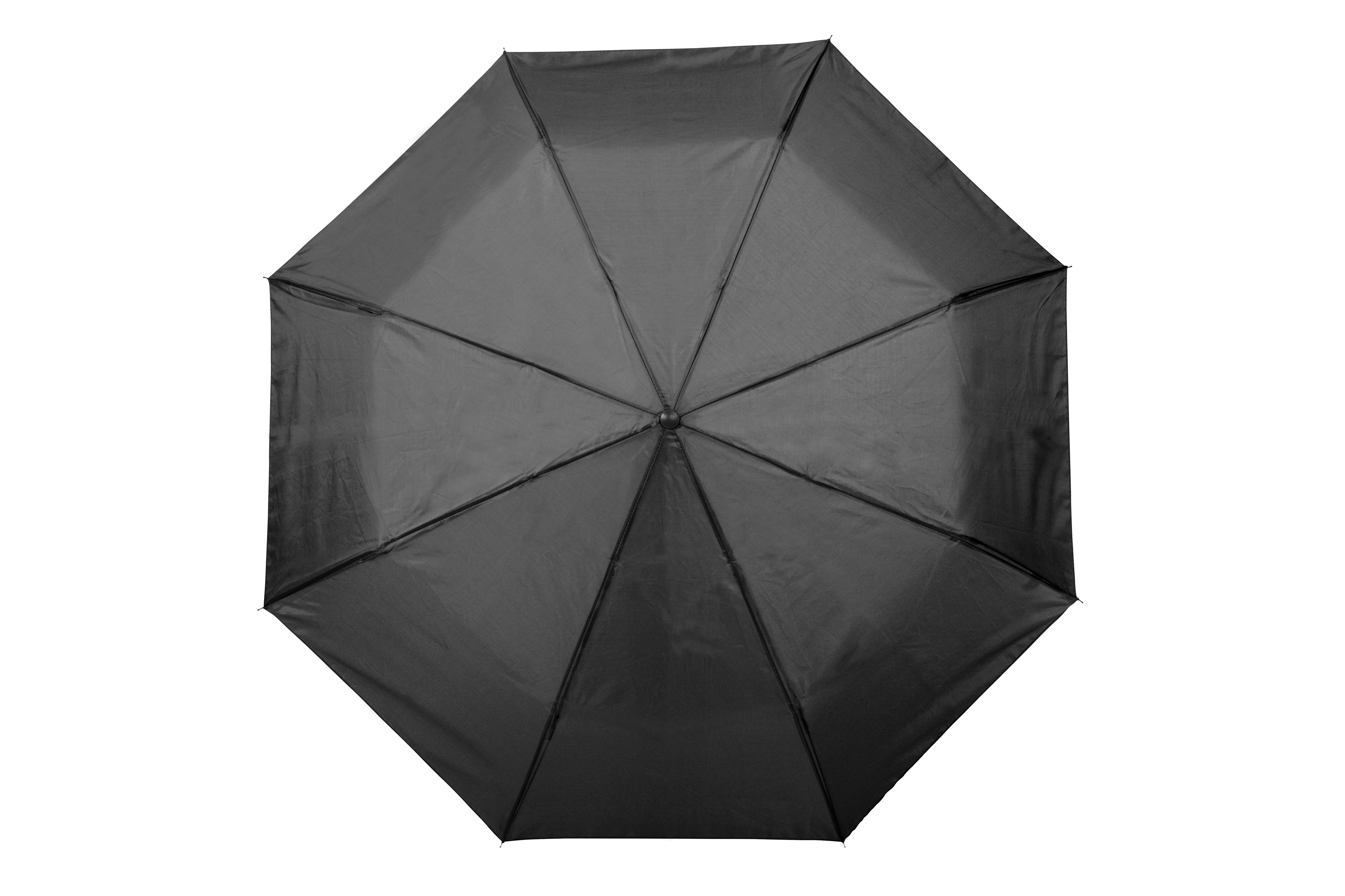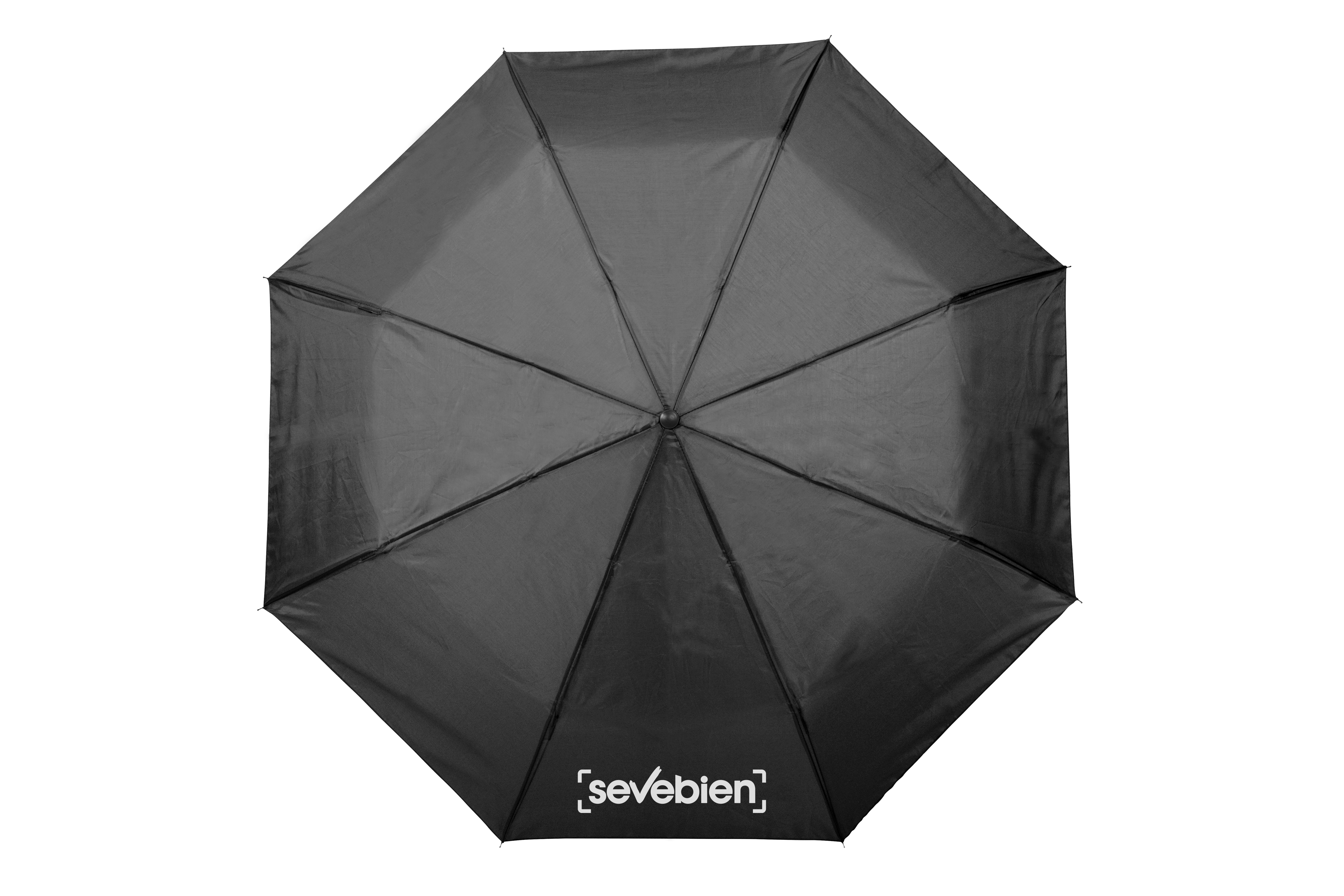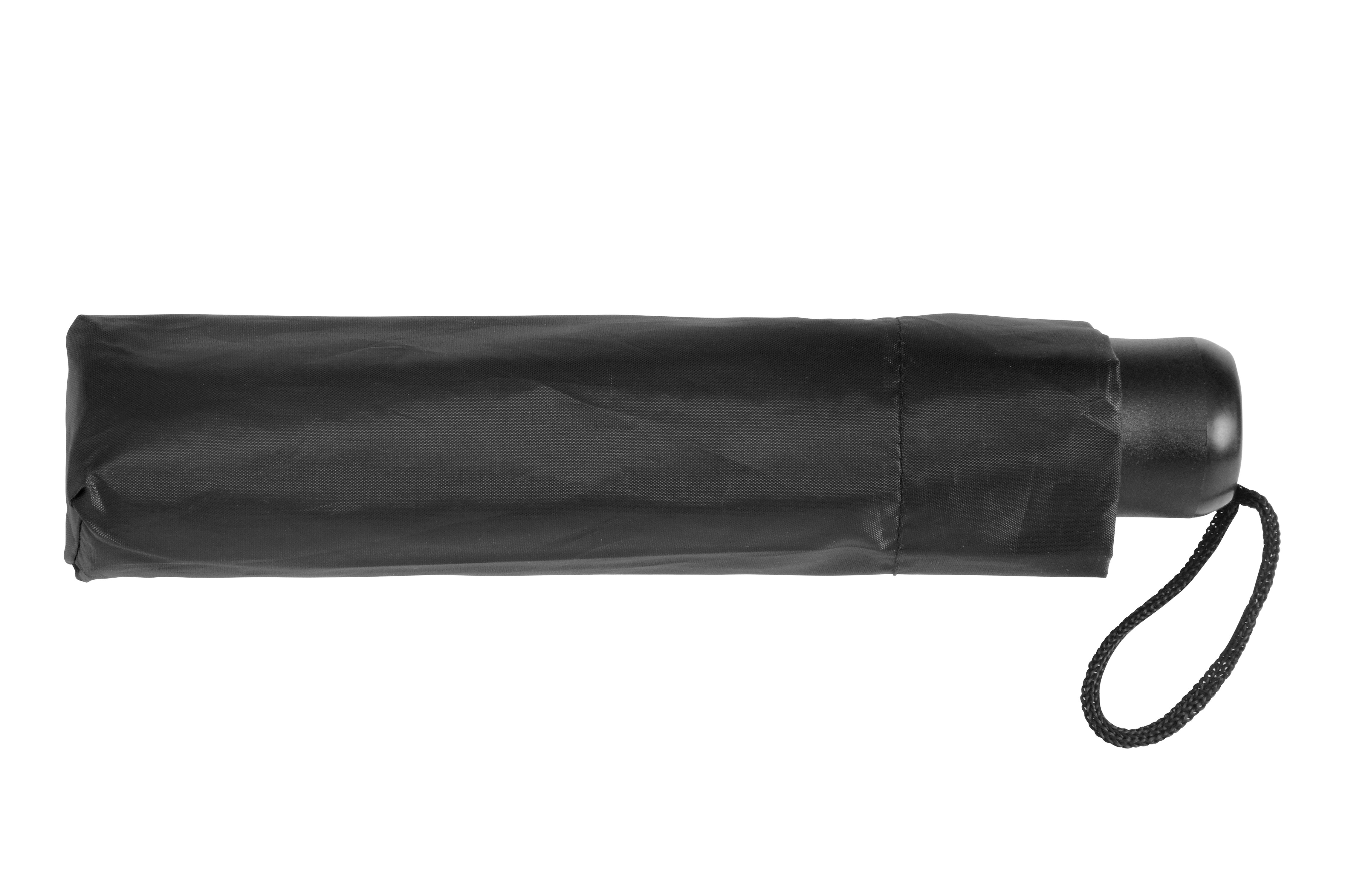 Ø 98 cm. 8 gajos. Ancho gajo 37 cm. Largo cerrado 24 cm. Largo abierto 54 cm. Poliéster, metal y plástico. Paraguas APERTURA Y CIERRE MANUAL. Eje y varillas metálicas. Mango de plástico negro con correa cordón color negro. Cierre con correa de velcro.