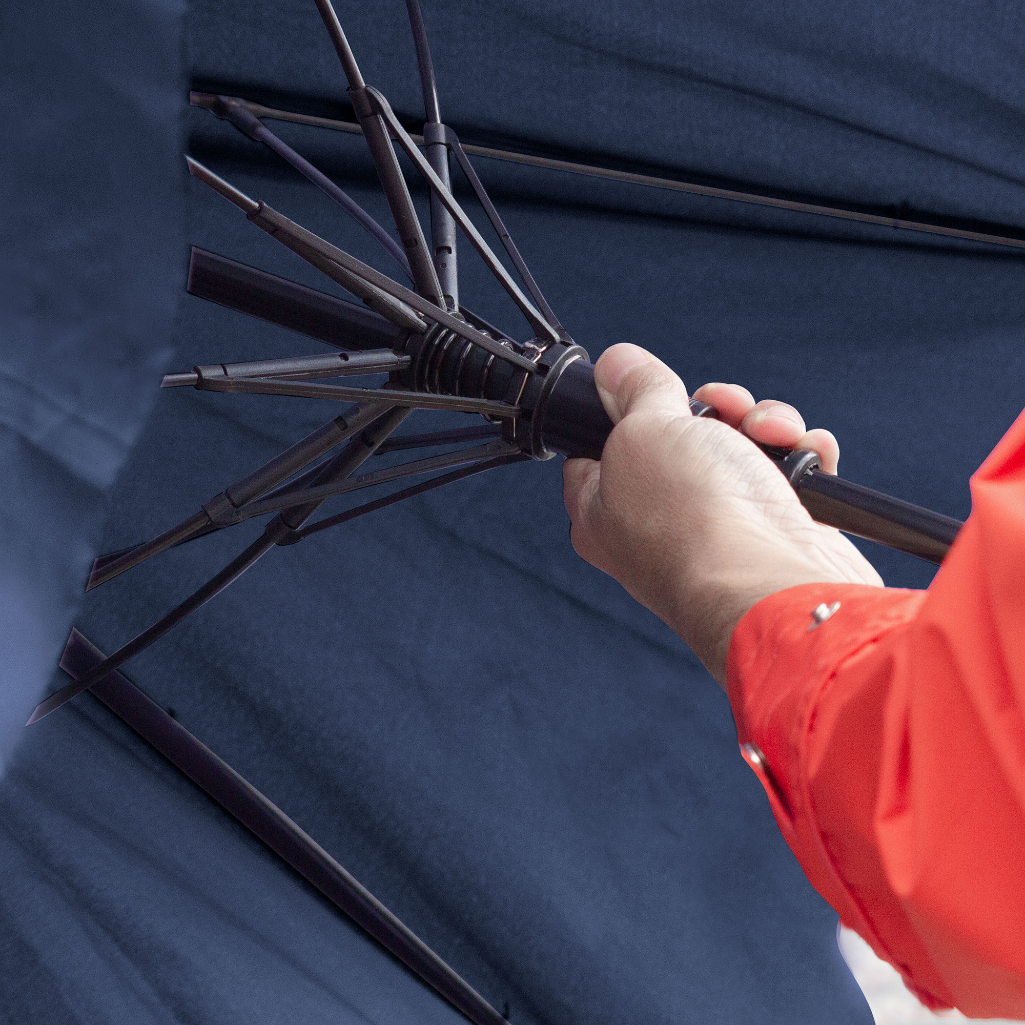 Ø 120 cm. 8 gajos. Ancho gajo 45 cm. Largo total 93 cm. Poliéster pongee, metal y EVA. Paraguas APERTURA AUTOMÁTICA Y CIERRE MANUAL. Eje metálico, varillas en fibra de vidrio , punta niquelada, mango en EVA. Botón a presión. Cierre con correa de velcro.