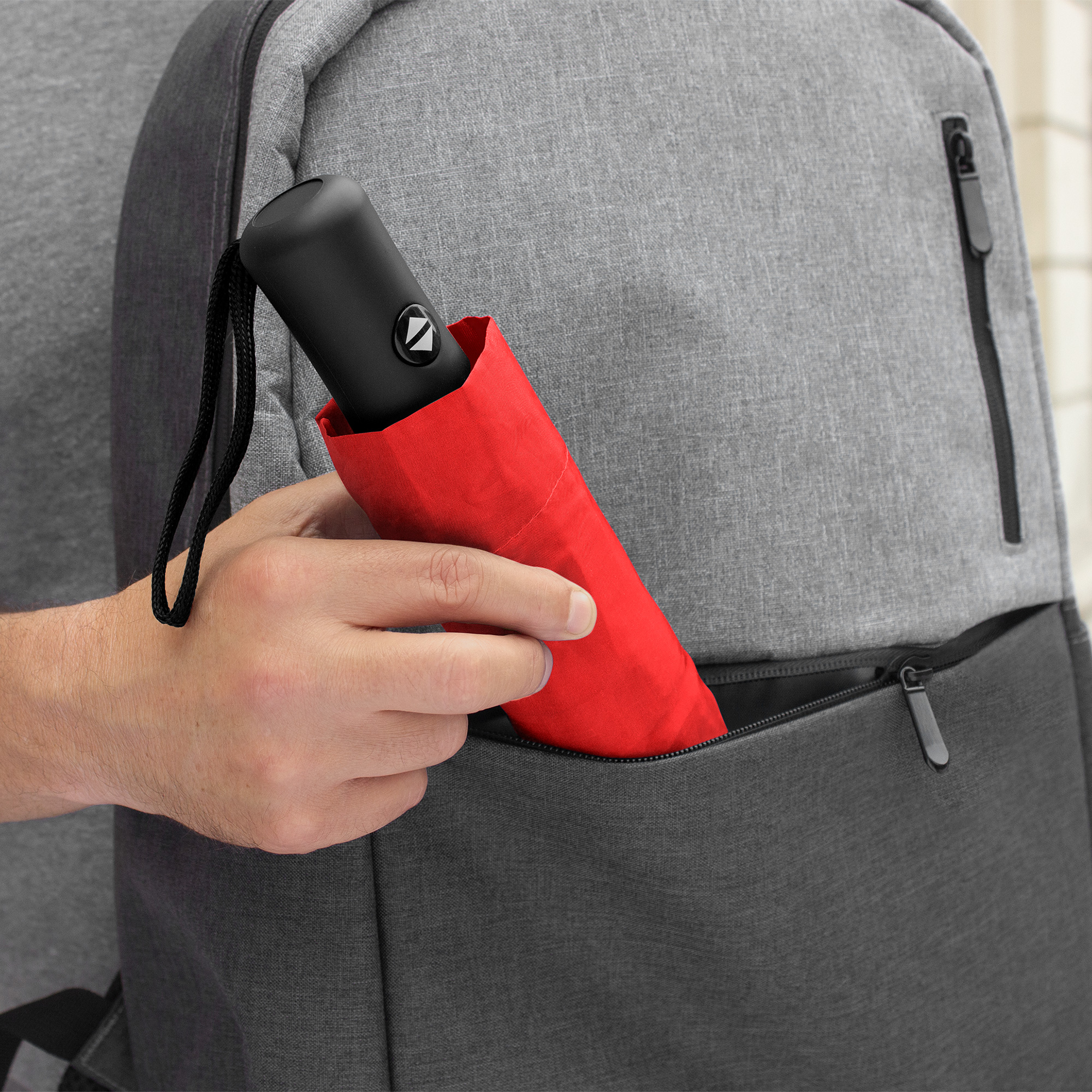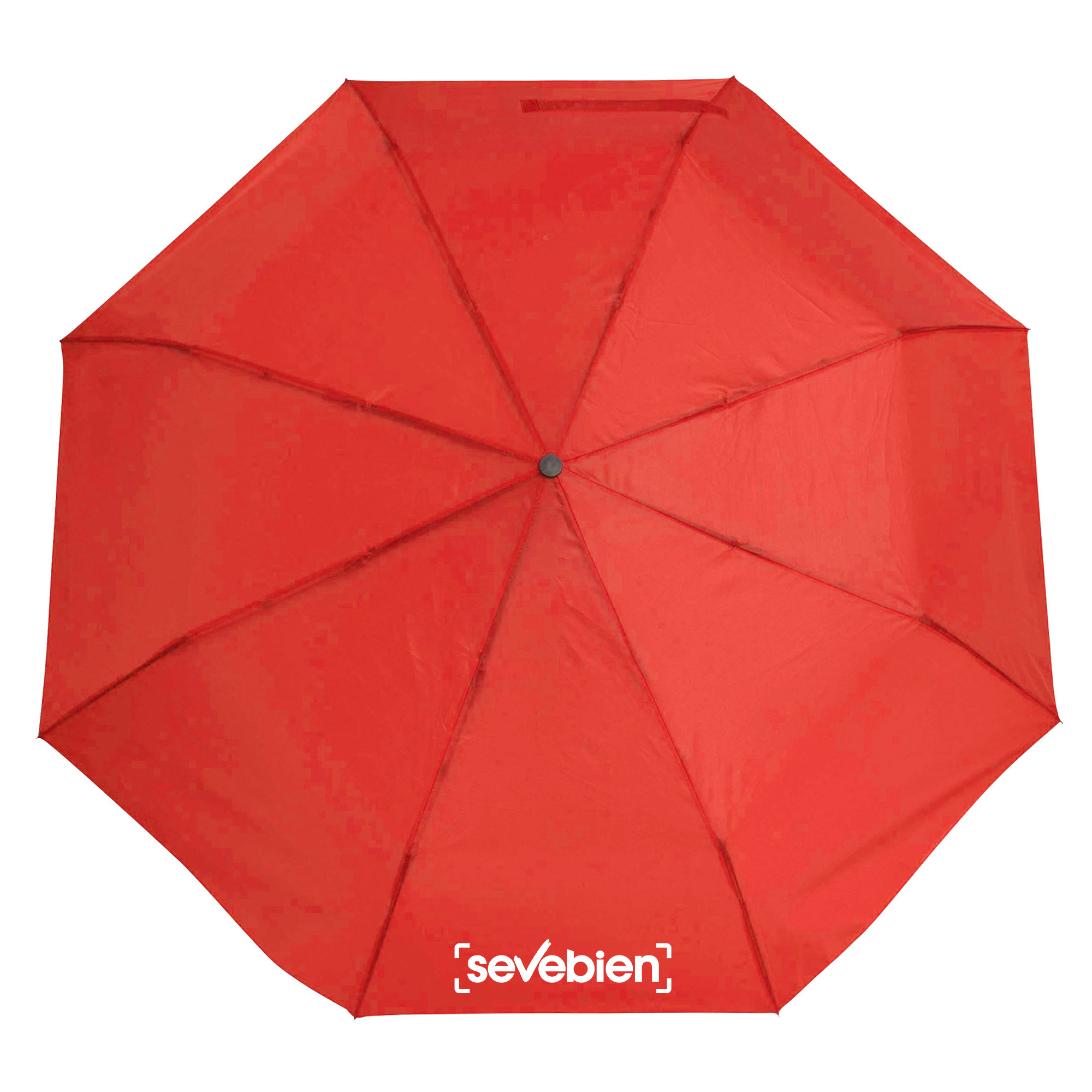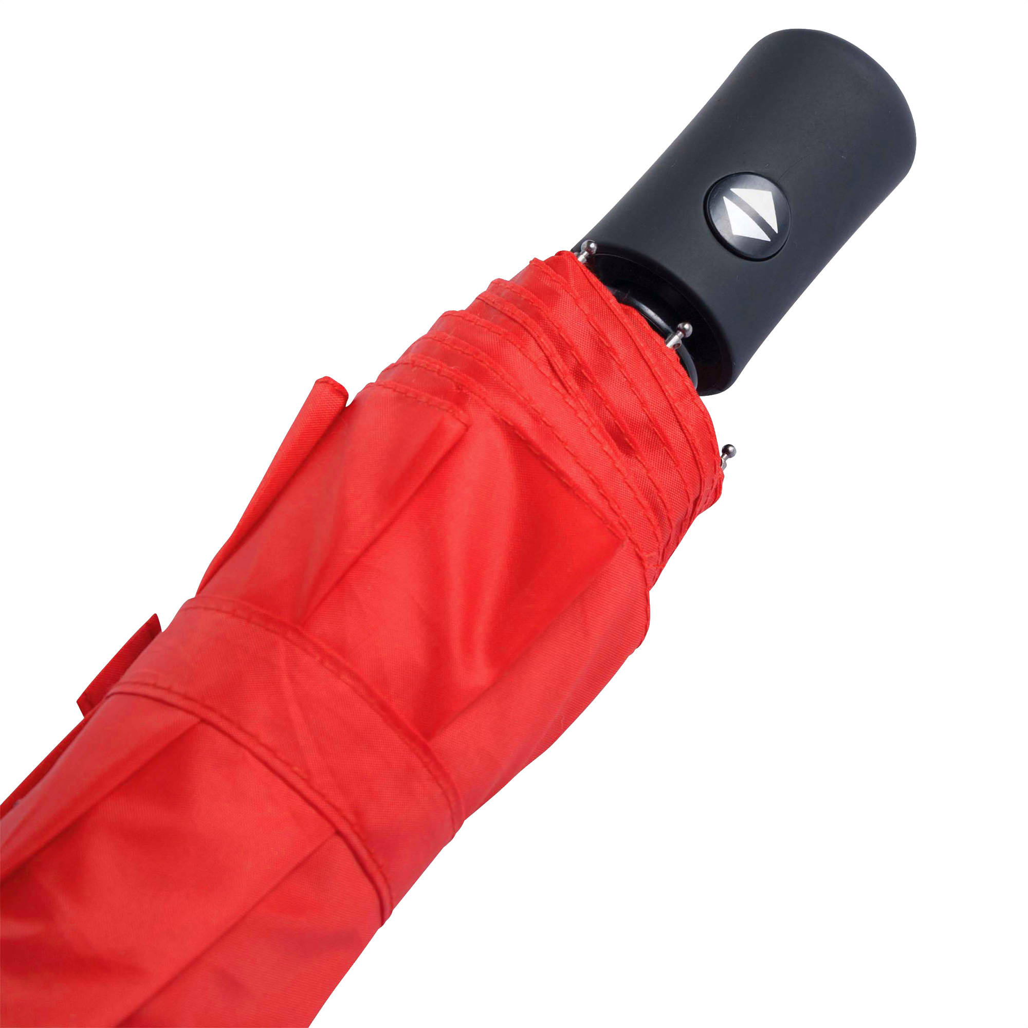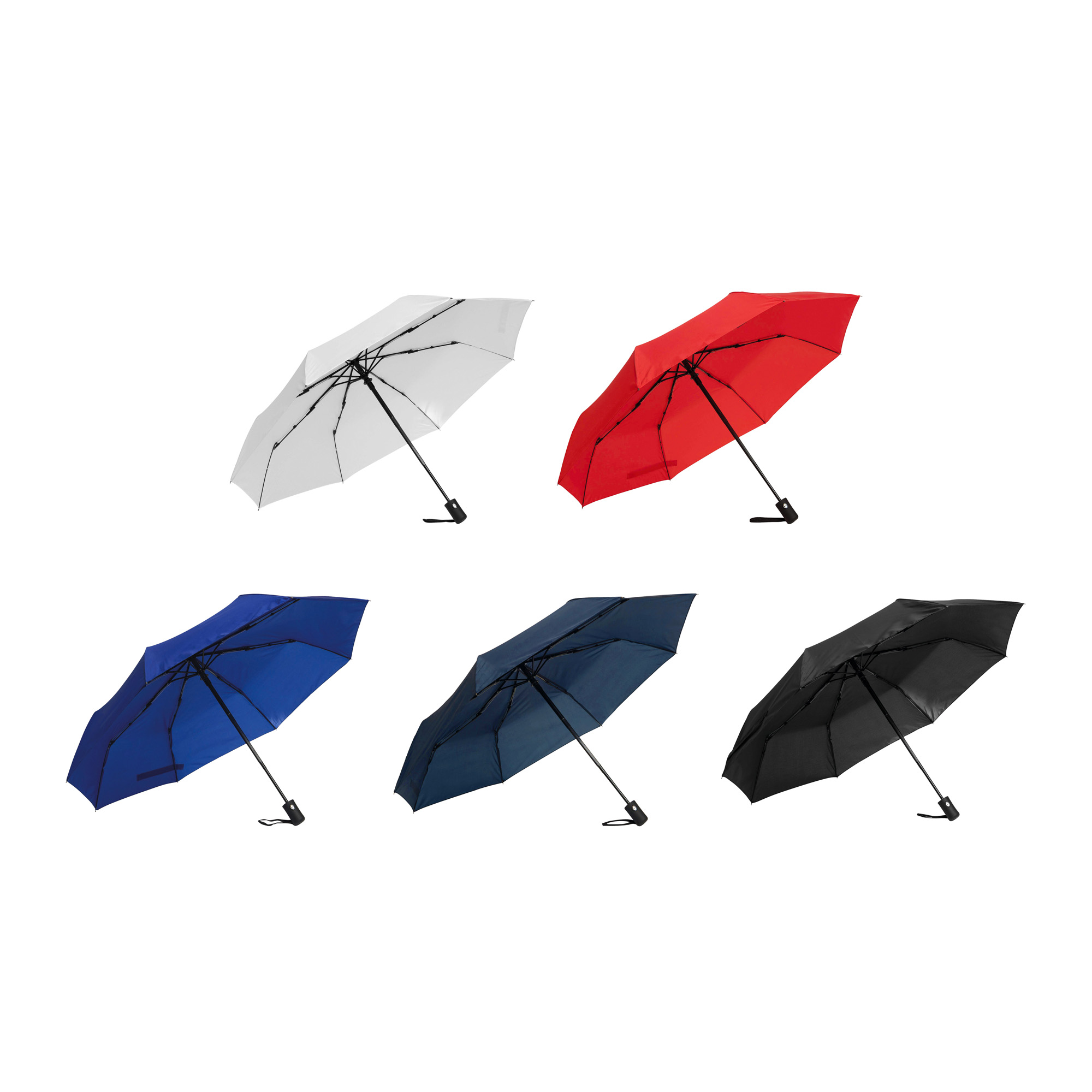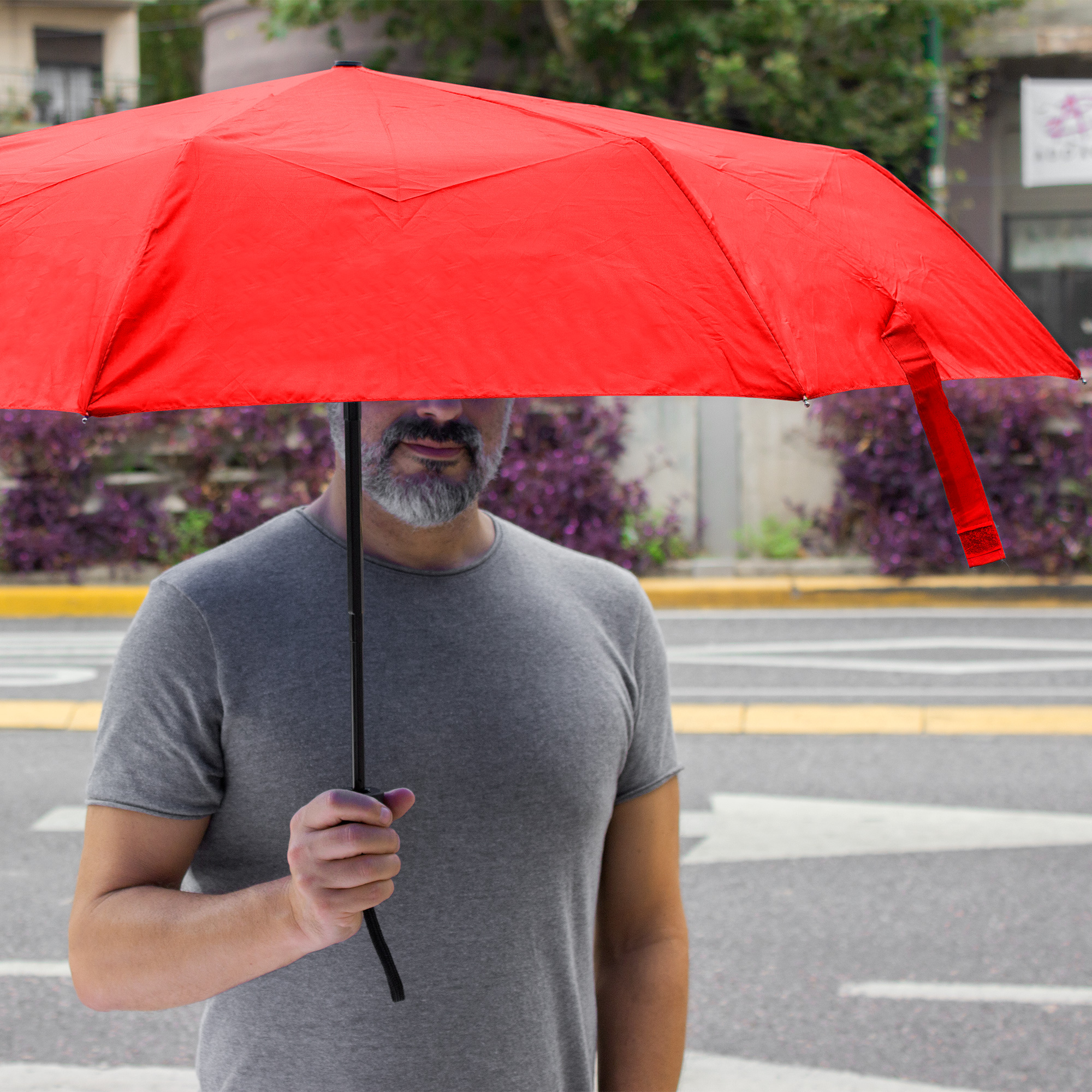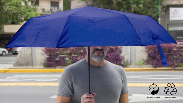 Paraguas APERTURA Y CIERRE AUTOMÁTICO. Eje y varillas metálicas. Mango de plástico engomado negro con correa cordón color negro. Botón a presión. Cierre con correa de velcro.