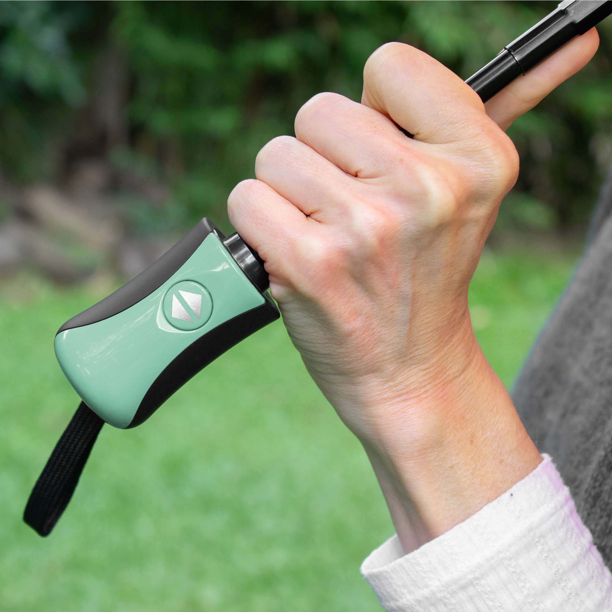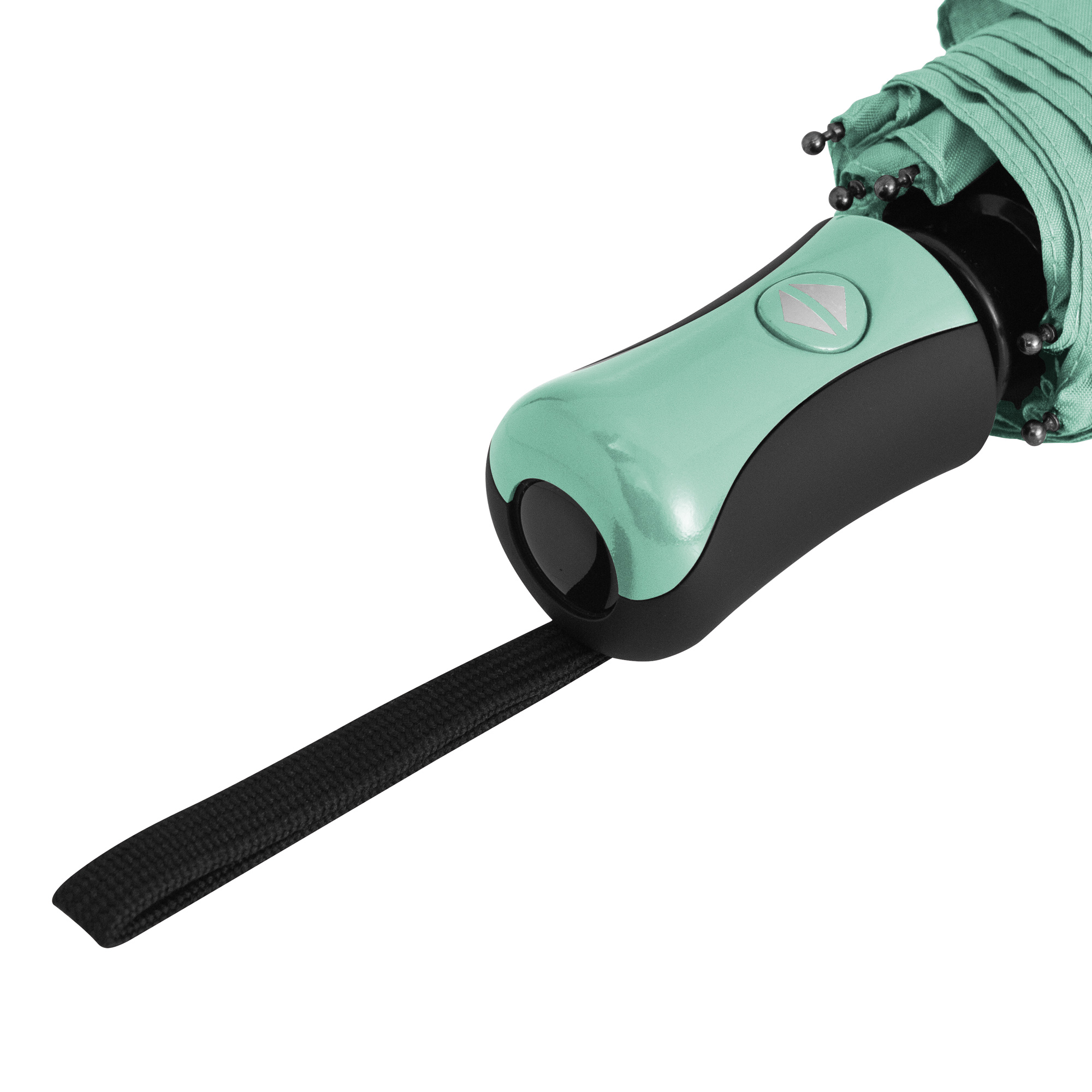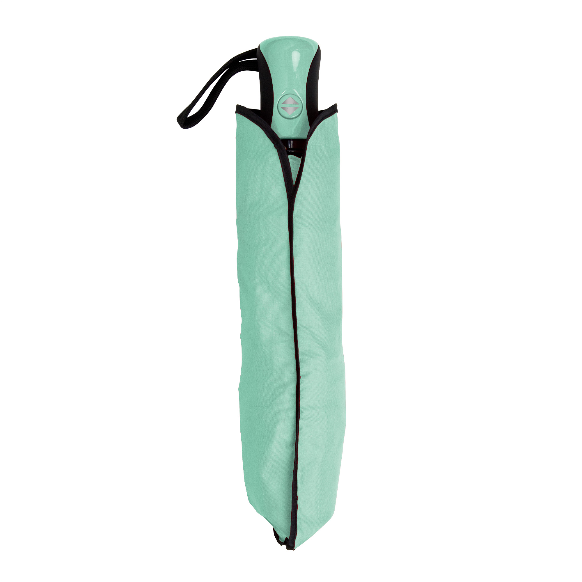 Paraguas APERTURA Y CIERRE AUTOMATICO. Eje metálico de color negro y varillas de fibra. Mango de plástico engomado con revestimiento de poliuretano color negro y detalles en color a tono con la tela, acabado brillante. Correa cordón color negro. Botón a presión. Tela con detalles en color negro. Cierre con correa de velcro.