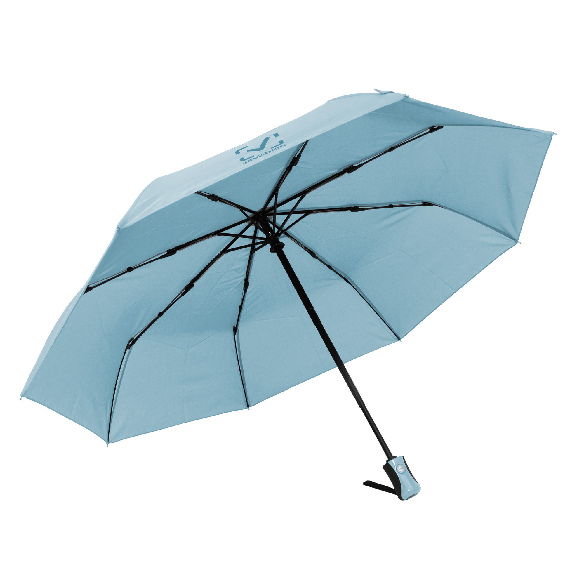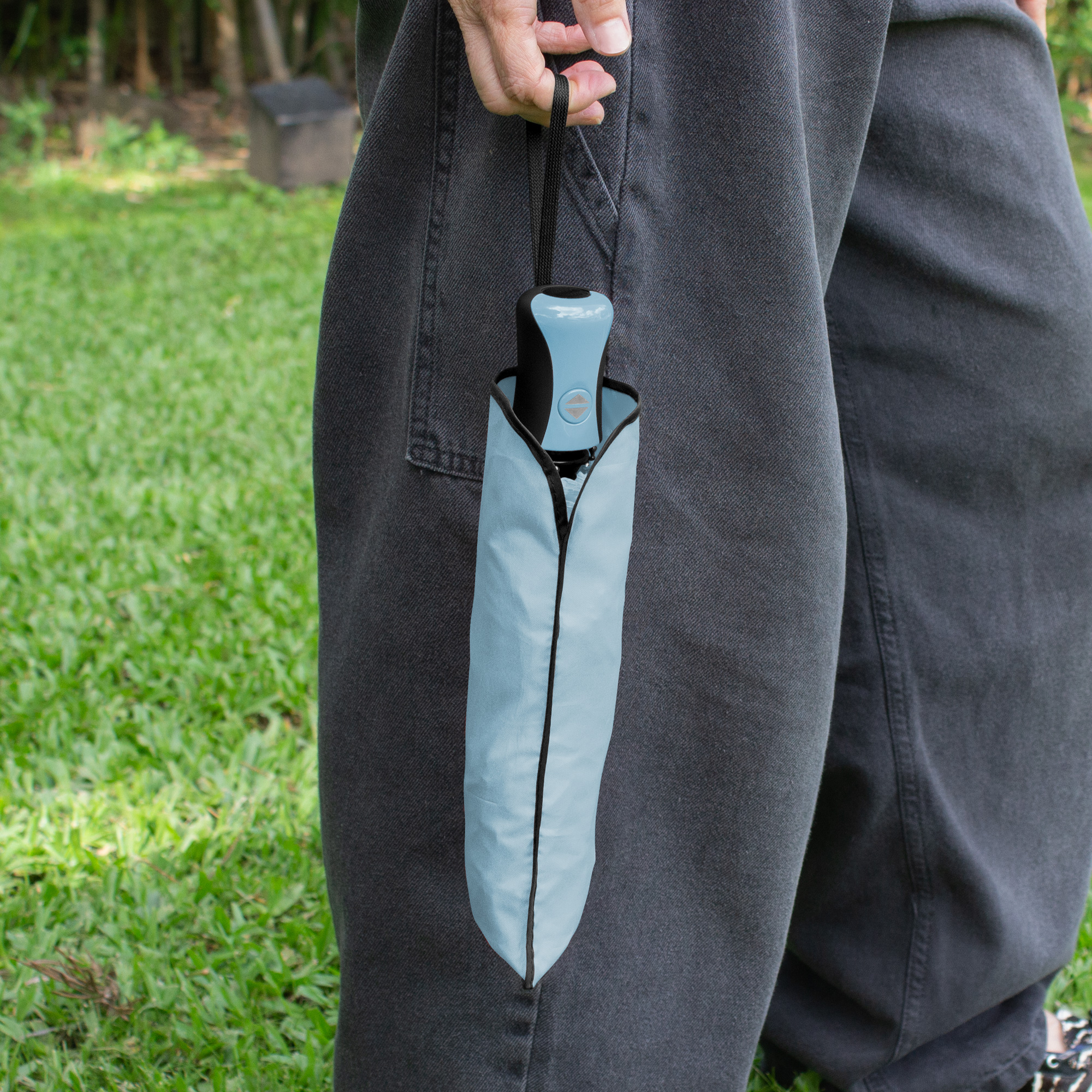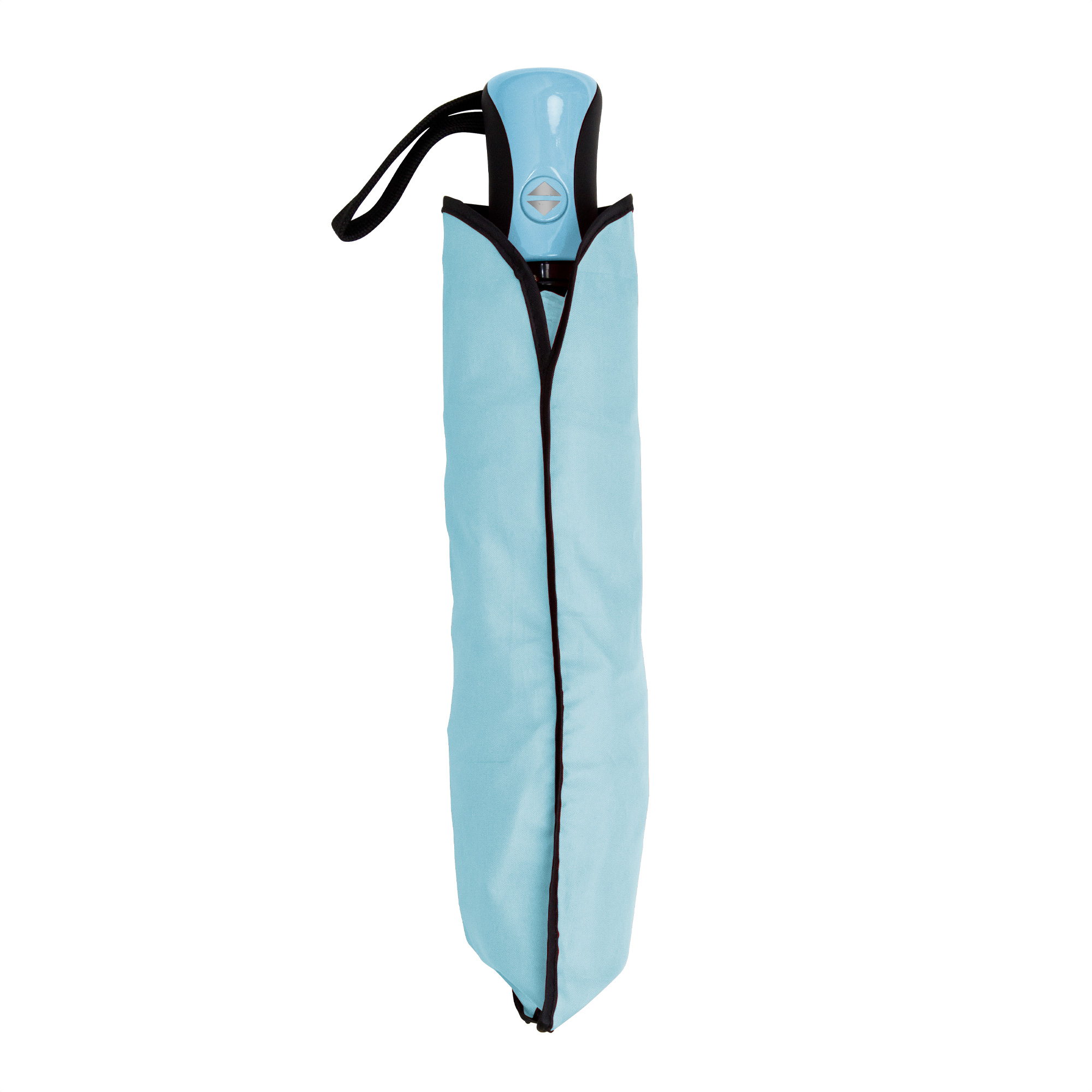 Paraguas APERTURA Y CIERRE AUTOMATICO. Eje metálico de color negro y varillas de fibra. Mango de plástico engomado con revestimiento de poliuretano color negro y detalles en color a tono con la tela, acabado brillante. Correa cordón color negro. Botón a presión. Tela con detalles en color negro. Cierre con correa de velcro.