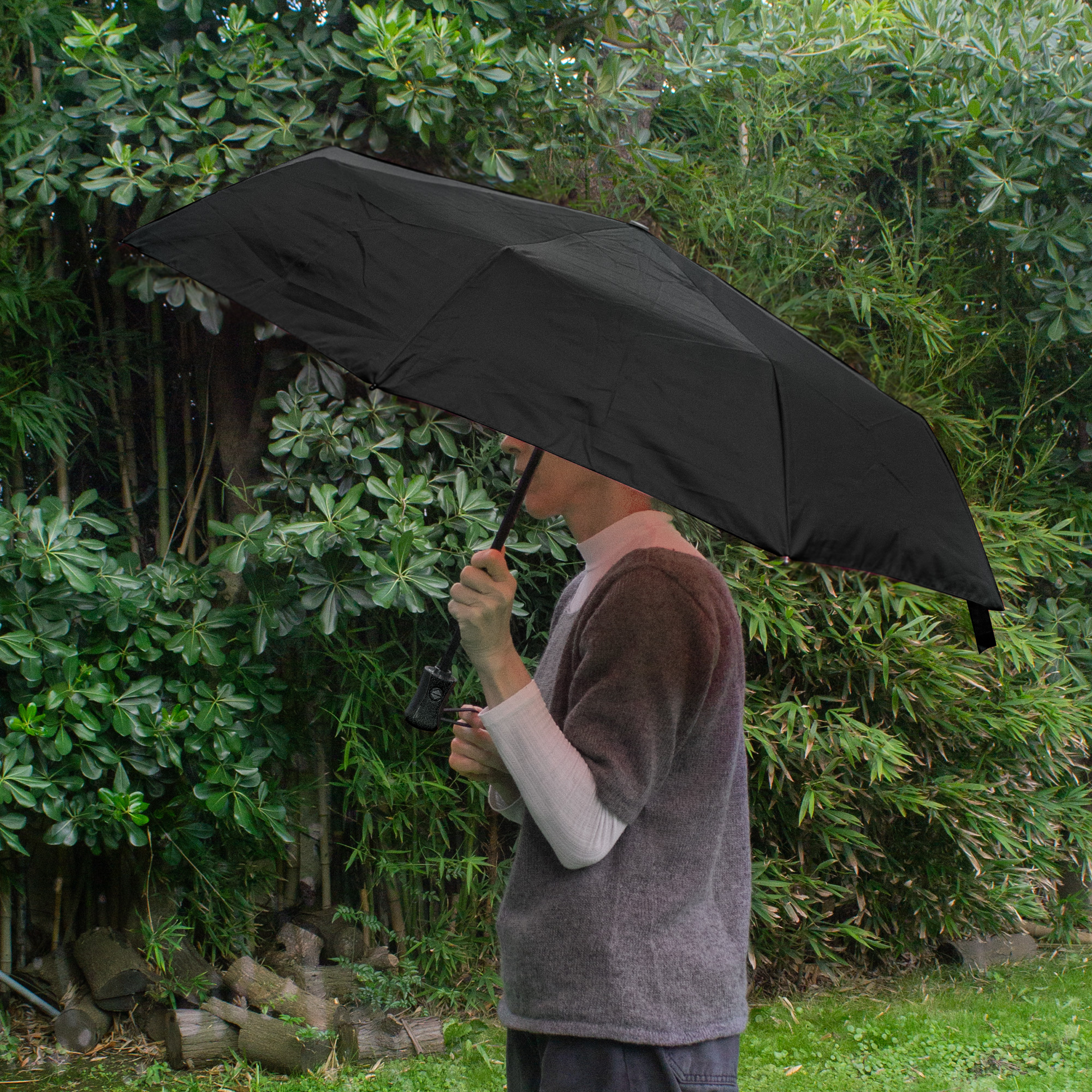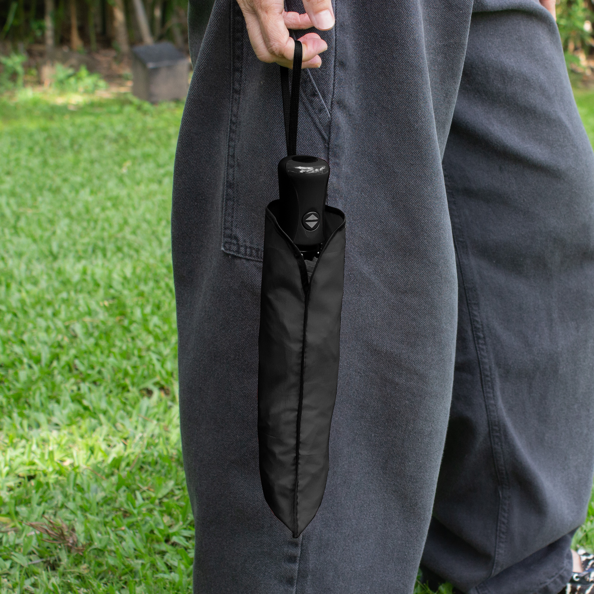 Paraguas APERTURA Y CIERRE AUTOMATICO. Eje metálico de color negro y varillas de fibra. Mango de plástico engomado con revestimiento de poliuretano color negro y detalles en color a tono con la tela, acabado brillante. Correa cordón color negro. Botón a presión. Tela con detalles en color negro. Cierre con correa de velcro.