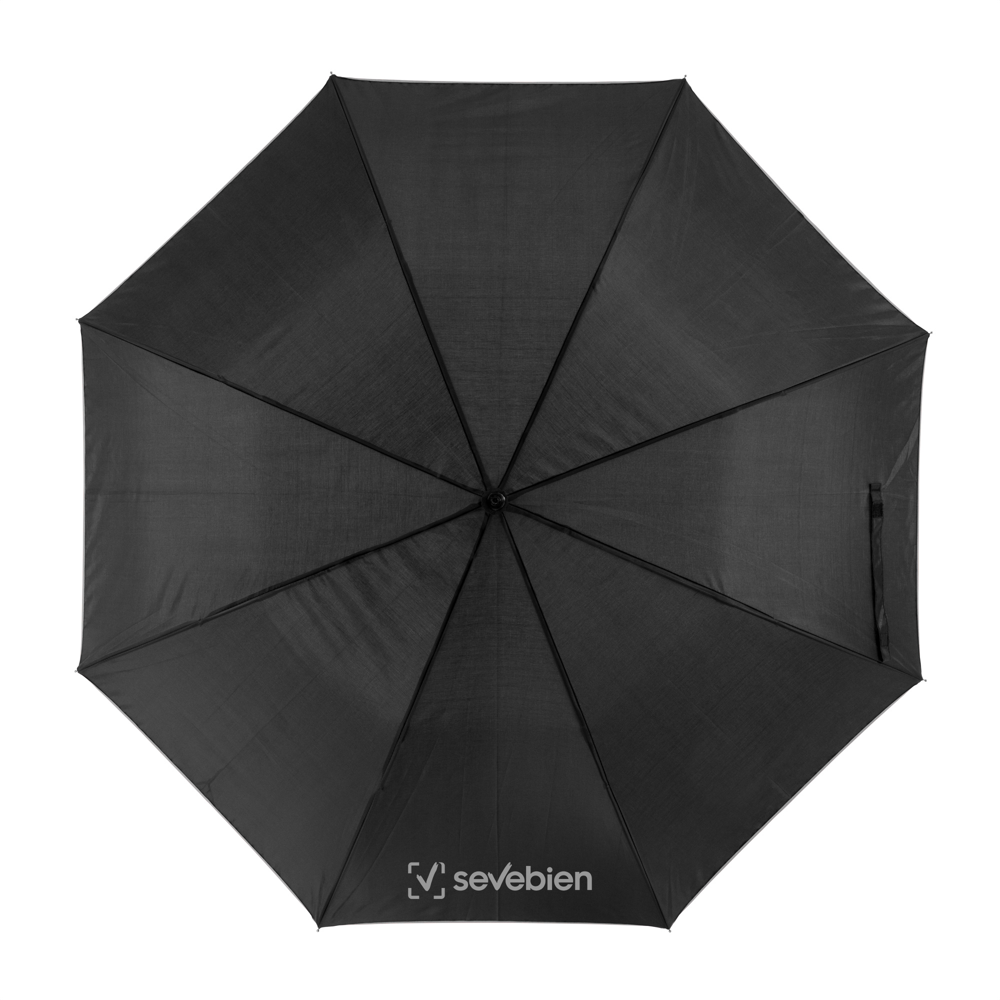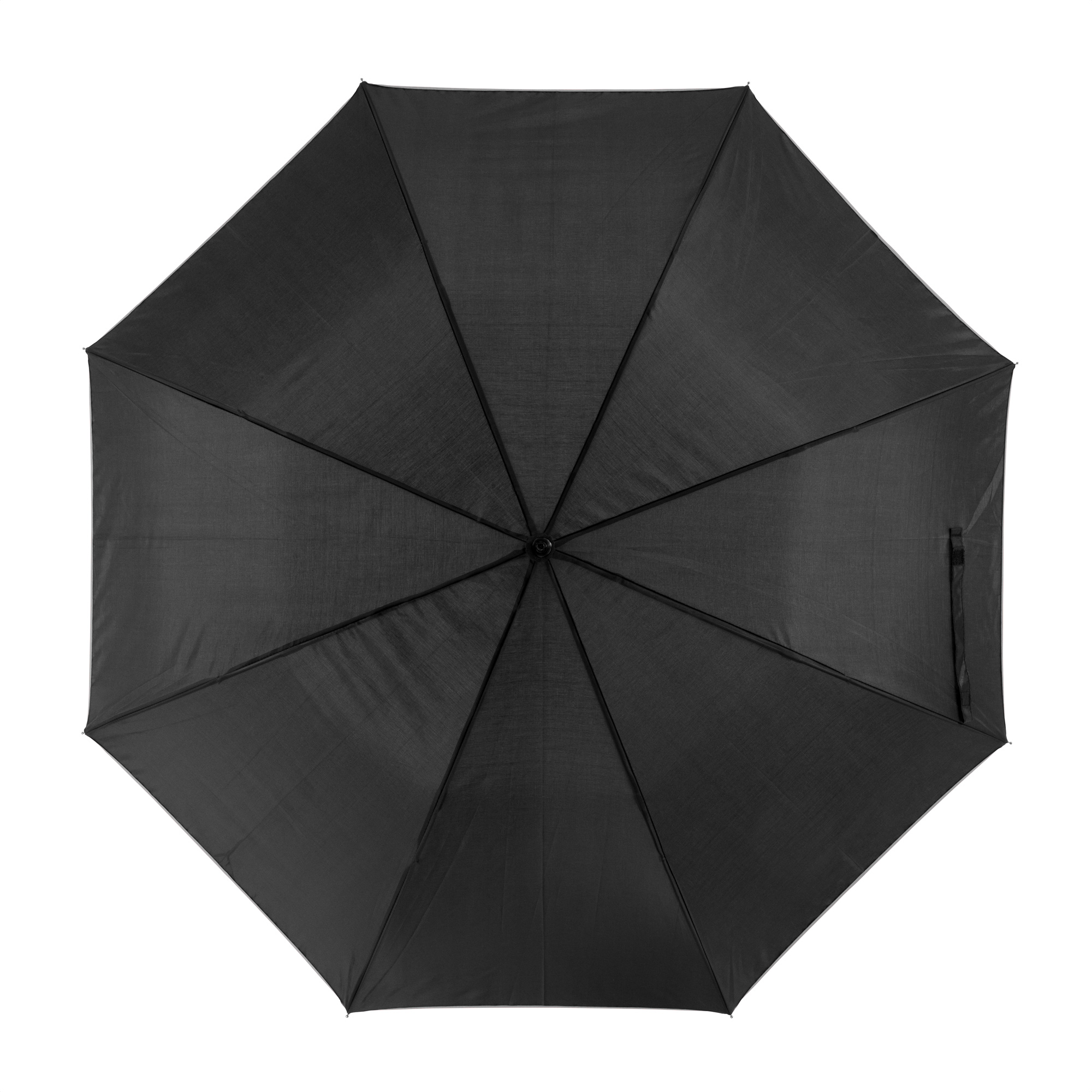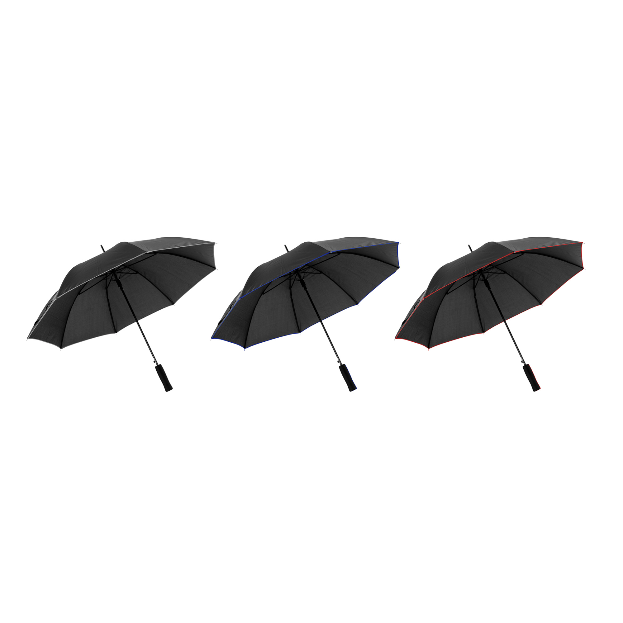 Paraguas APERTURA AUTOMÁTICA Y CIERRE MANUAL. Eje y varillas metálicas. Tela negra con detalle de color. Mango de goma eva de doble color. Botón a presión. Cierre con correa de velcro.