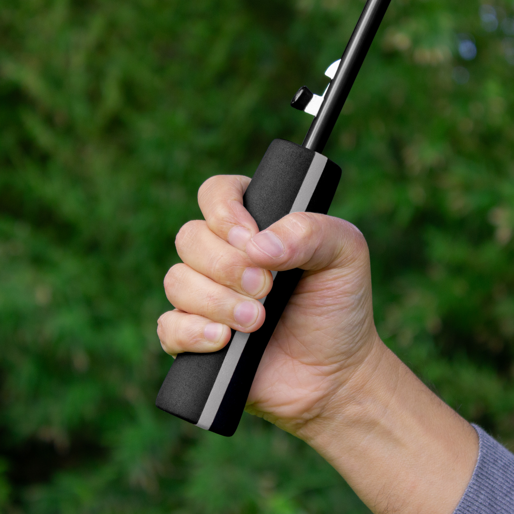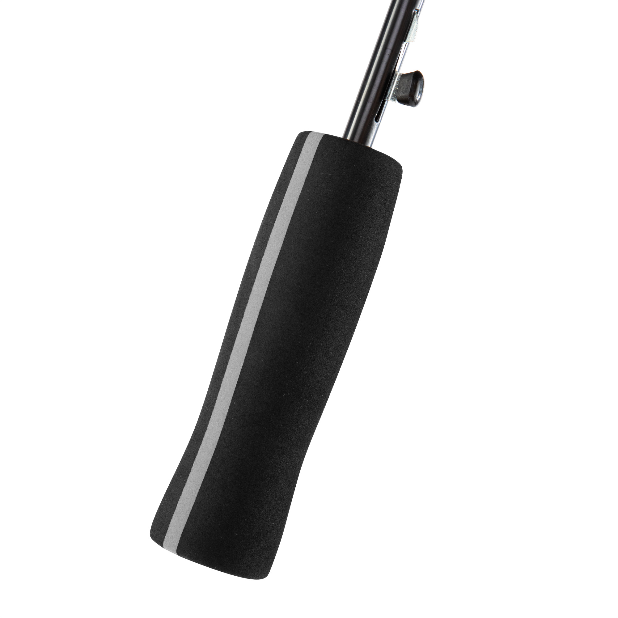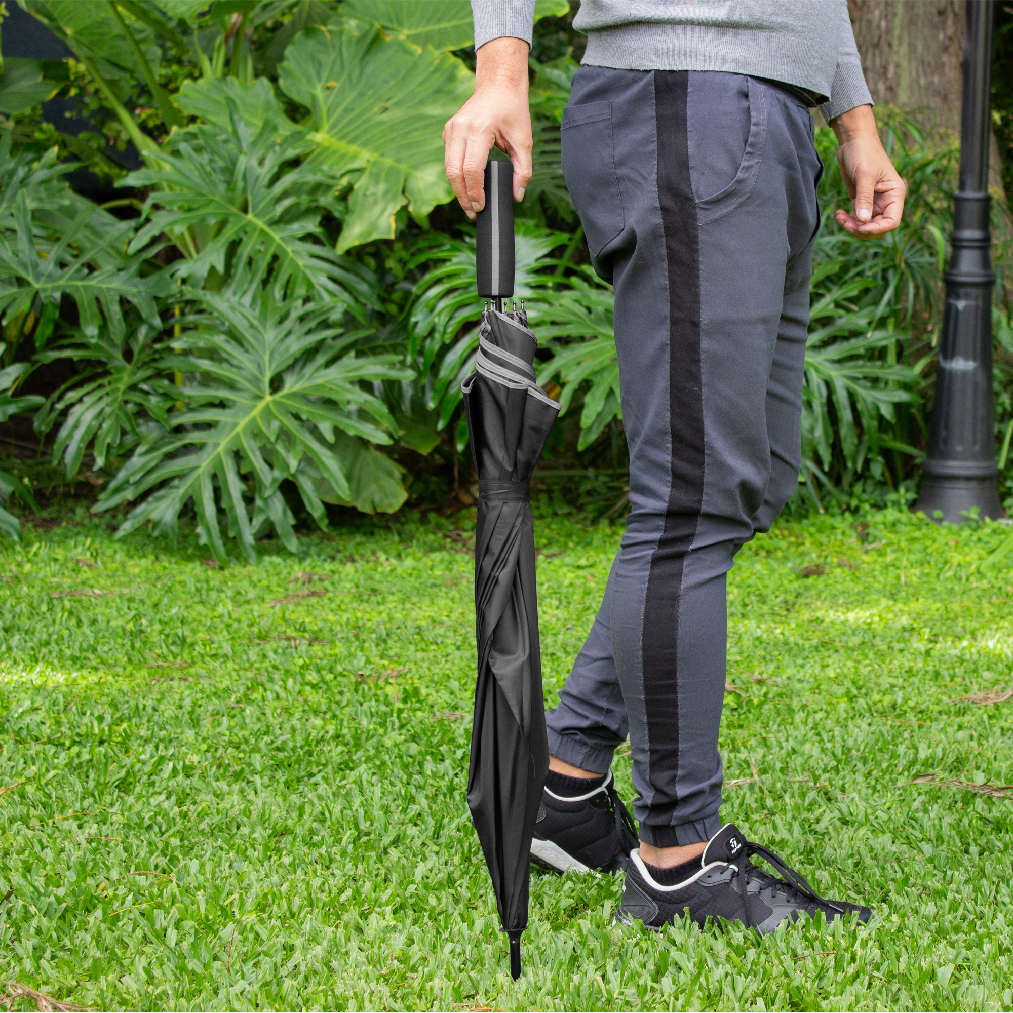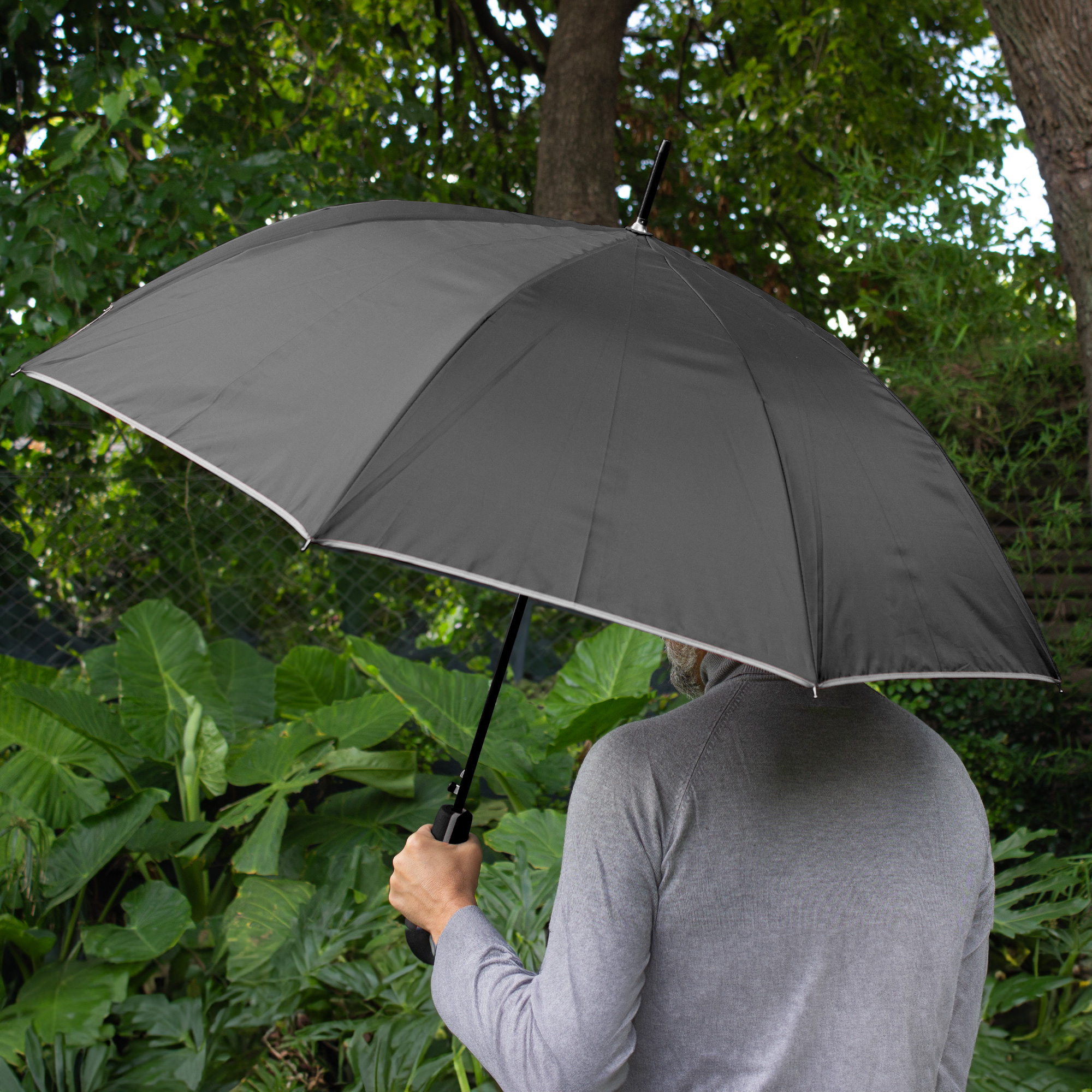Paraguas APERTURA AUTOMÁTICA Y CIERRE MANUAL. Eje y varillas metálicas. Tela negra con detalle de color. Mango de goma eva de doble color. Botón a presión. Cierre con correa de velcro.